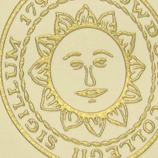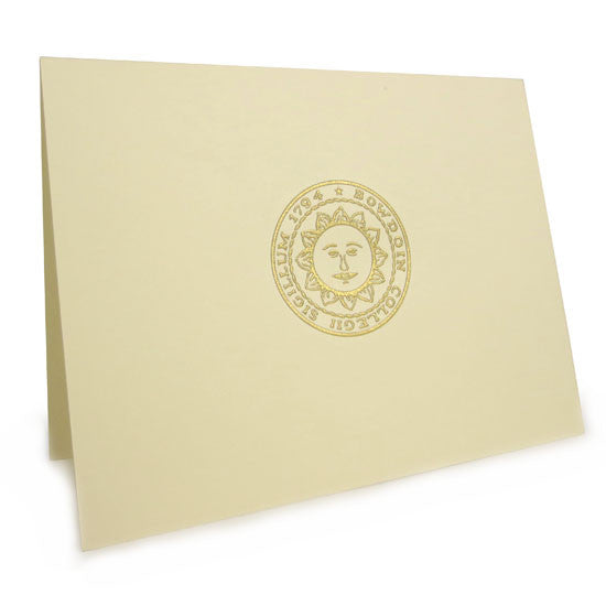 10-pack ivory notecards with embossed gold Bowdoin sun seal. Envelopes included. From Balfour.