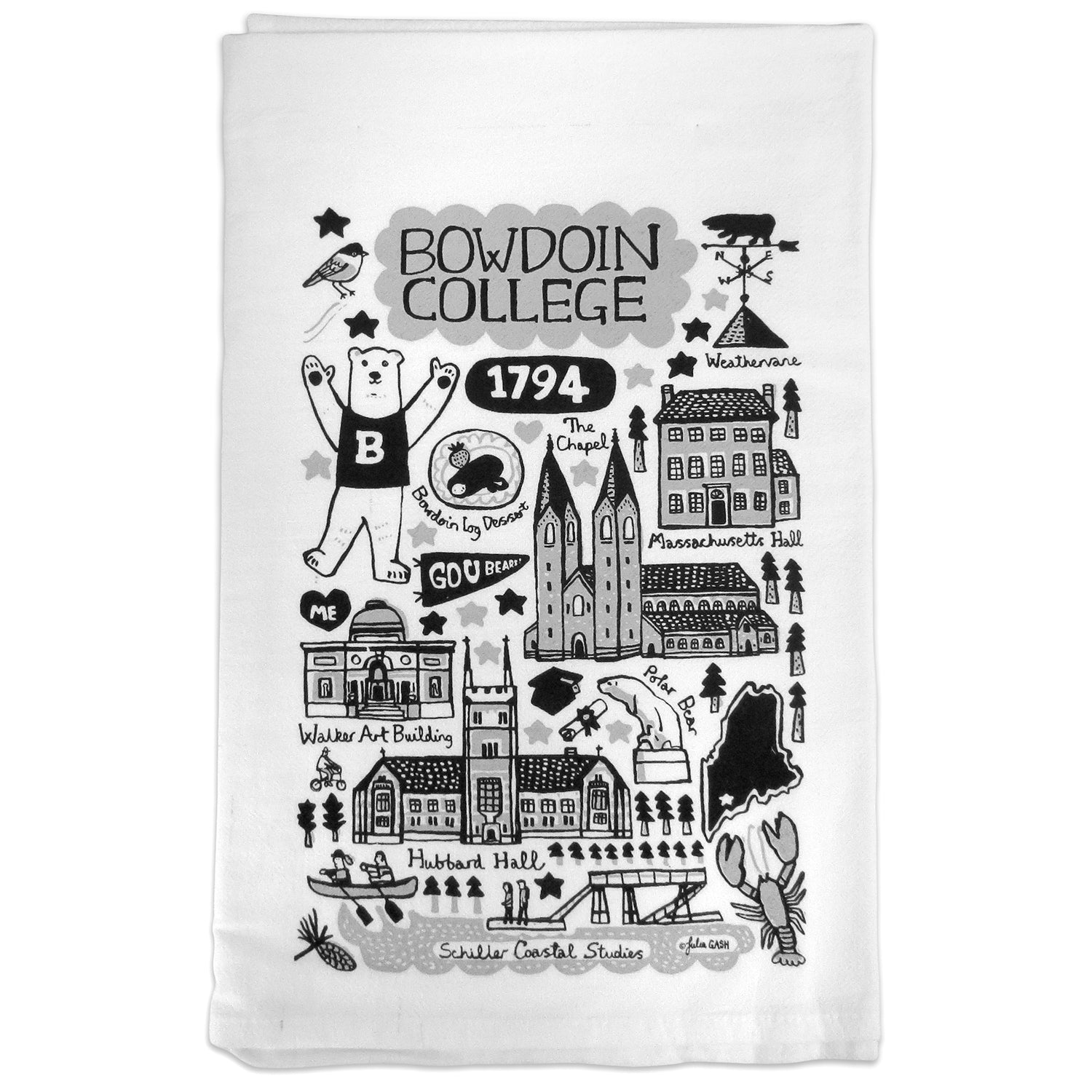 100% organic cotton kitchen towel with whimsical illustrations of Bowdoin College campus icons by artist Julia Gash.