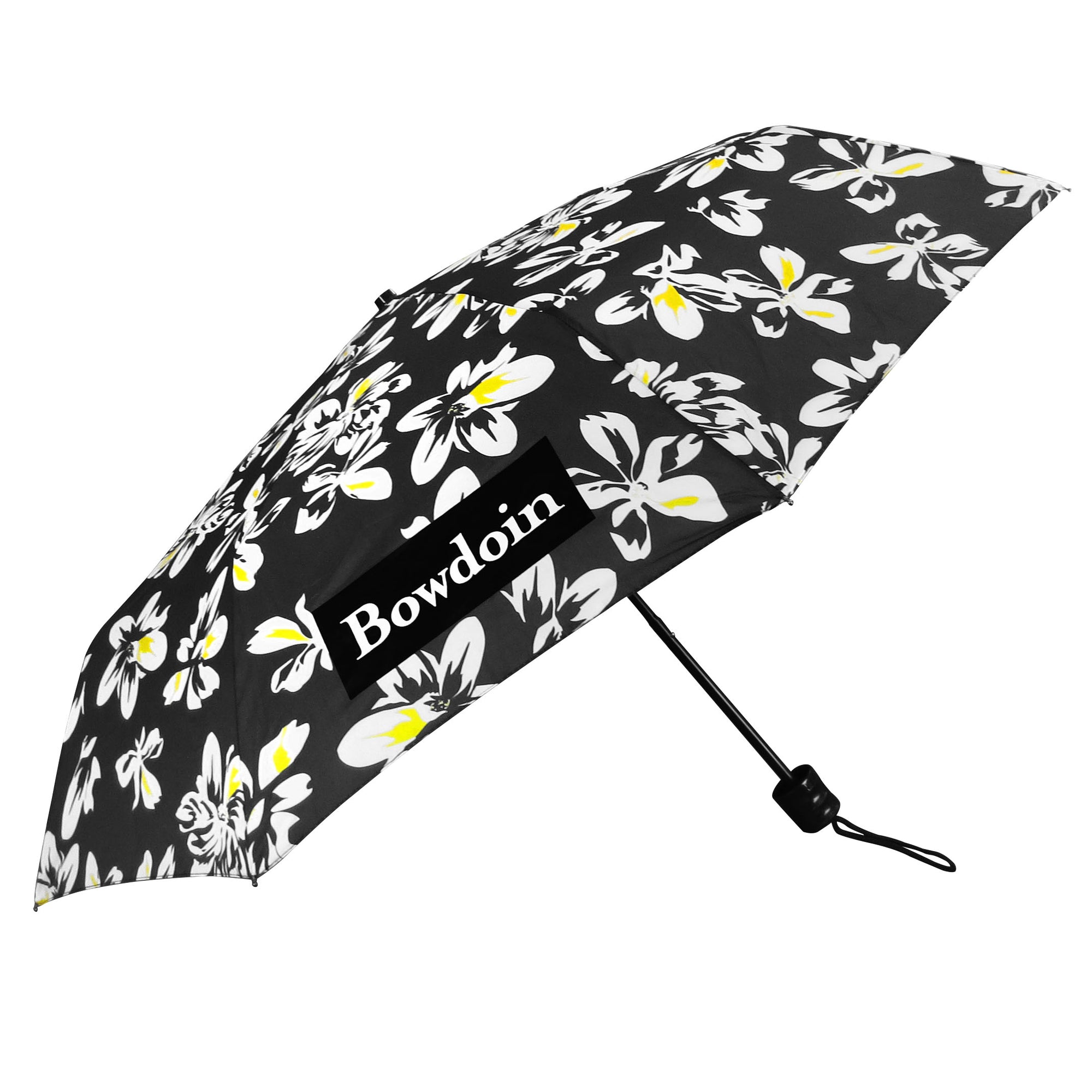 42" collapsible umbrella with manual telescoping shaft and Bowdoin wordmark imprint. Folds to 10". Includes hibiscus print case. From Storm Duds.