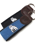 Belted Cow key fob with custom Bowdoin ribbon sewn onto sturdy cotton webbing and embossed leather connector.
