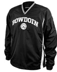Windproof V-neck raglan long-sleeved shirt with jersey lining, adjustable waist, side pockets, and a zipper vent on the left side. Black with contrast white stripes on collar and sides. Embroidered BOWDOIN and mascot medallion appliqué. From CI Sport.