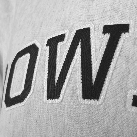 Our classic heavy reverse-weave heather gray crewneck sweatshirt from Champion with ribbed side panels and two-color stitched BOWDOIN appliqué in black and white twill.