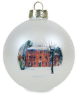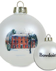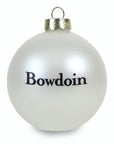 Shatterproof bulb ornament decorated with Massachusetts Hall on the front, and the Bowdoin wordmark on the back. From Waitkus Studios.
