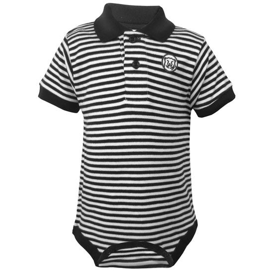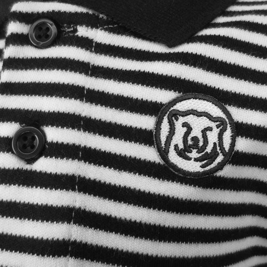 Black and white striped polo-style diaper shirt with embroidered polar bear medallion patch appliqué. From Creative Knitwear.