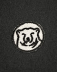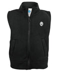 Cozy black polar fleece zip-up vest with side pockets and embroidered Bowdoin mascot medallion appliqué. From Creative Knitwear.