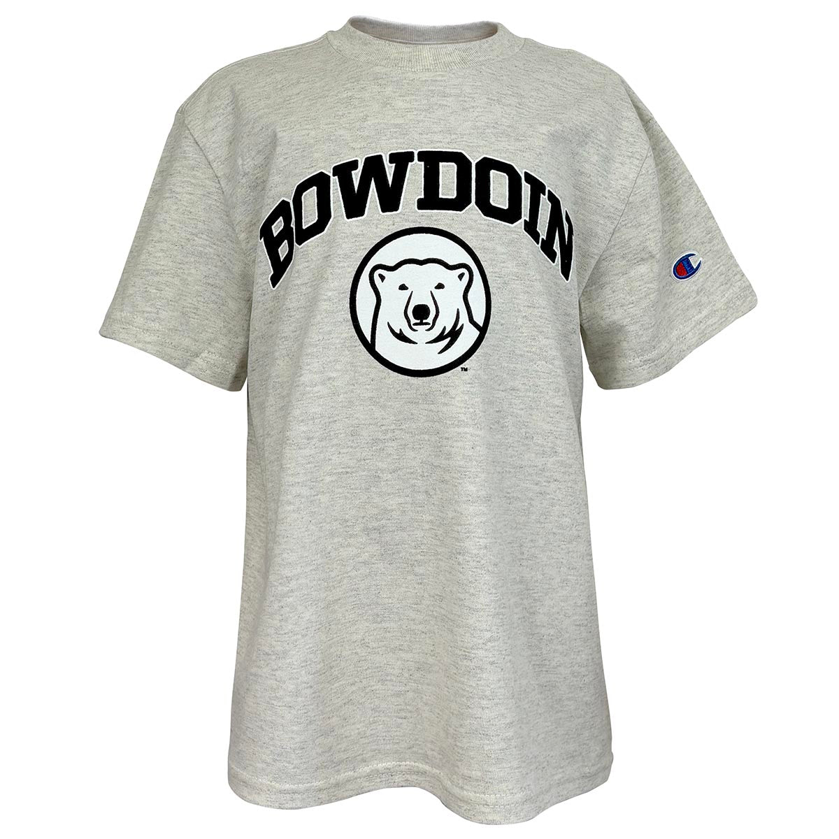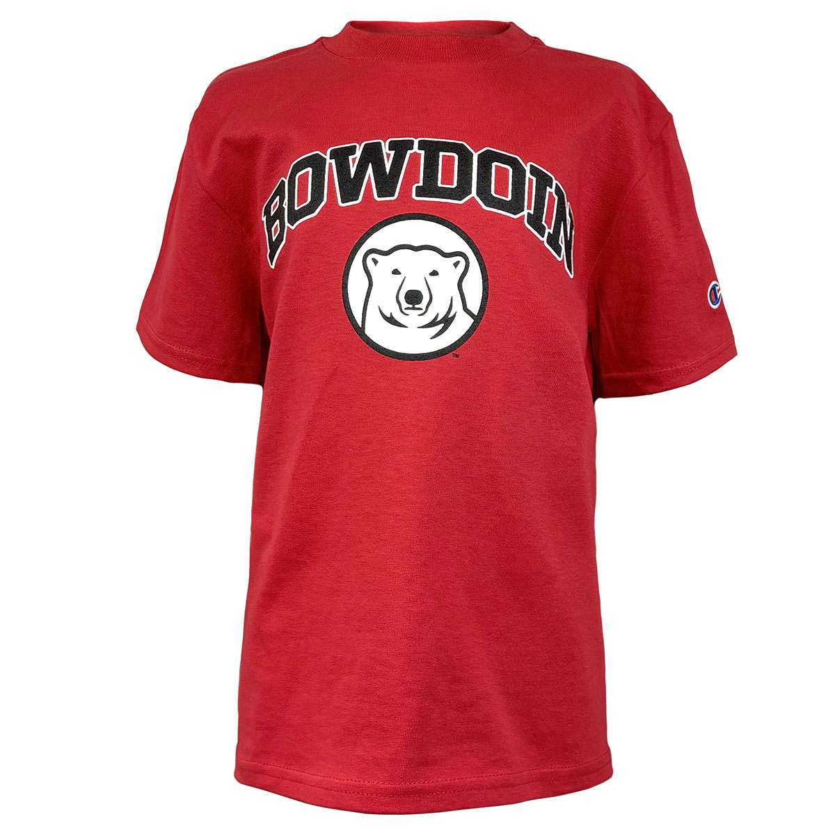 Children's T-shirt with BOWDOIN and polar bear mascot medallion imprint on chest. From Champion.